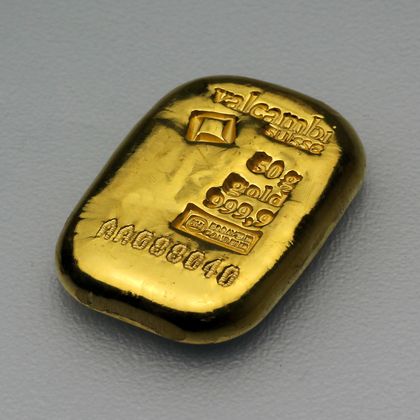 Gegossene 50g Goldbarren der Schweizer Prägeanstalt Valcambi SA können Sie im ESG Onlineshop zum stets aktuellen Preis kaufen.