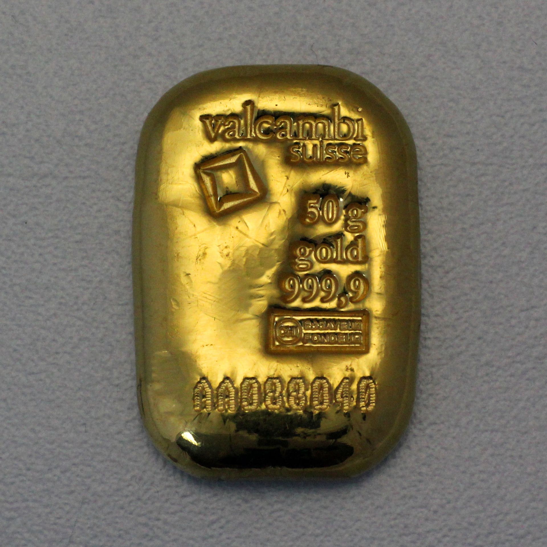 Hierbei handelt es sich um gussfrische 50g Feingoldbarren des Schweizer Herstellers Valcambi. Die Barren sind samt Zertifikat im Blister eingeschweißt.