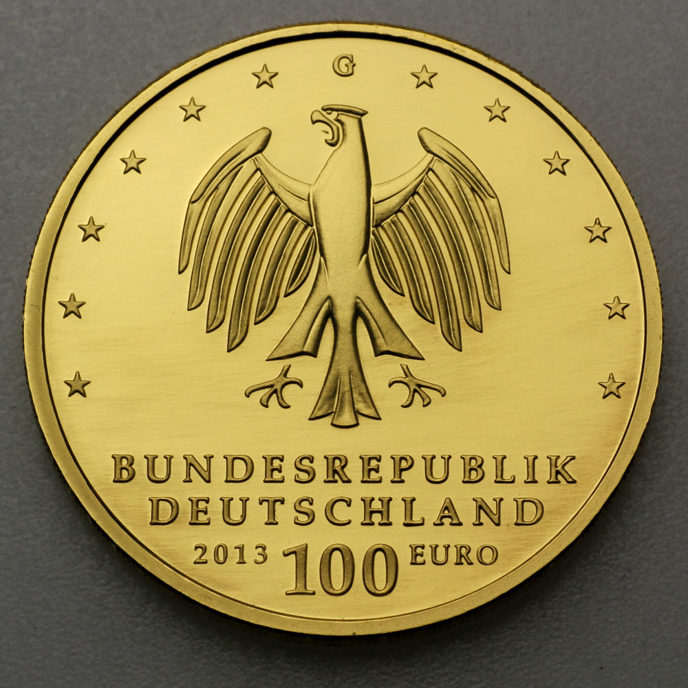 Umgedreht zeigt die Münze den Bundesadler als staatliches Symbol Deutschlands, flankiert von den zwölf EU-Sternen. Ergänzt wird dieses Ensemble durch die zugehörige Landesbezeichnung, hundert Euro als Nennwert sowie das Erscheinungsjahr 2013.