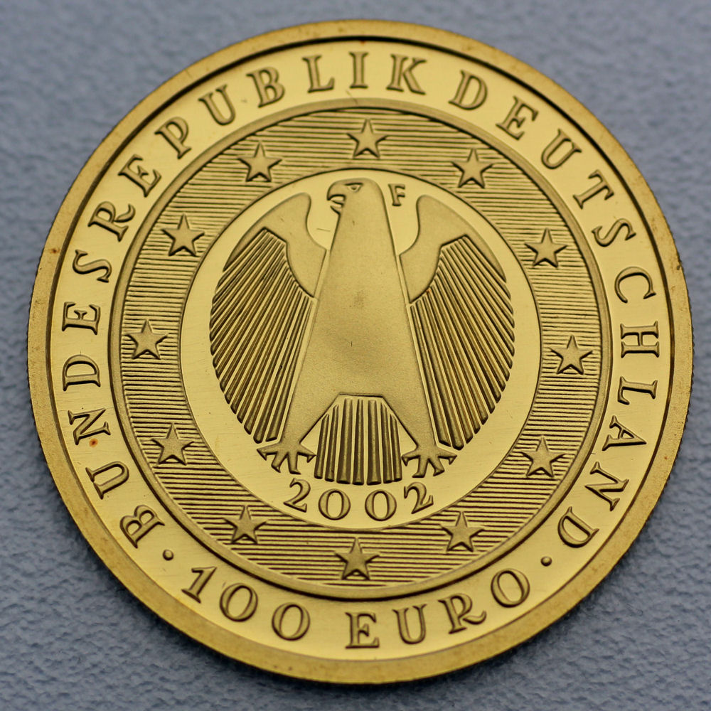 Die Kehrseite zeigt mittig den Bundesadler. Diese Variante des Wappentiers stellt dieselbe Variante dar, wie sie auch auf Umlaufmünzen der Euro-Währung für den alltäglichen Zahlungsverkehr ihren Platz gefunden hat. Umgeben wird das Wappentier von den zwölf Sternen Europas, ergänzt durch den Nennwert "100 EURO", das Ausgabeland "BUNDESREPUBLIK DEUTSCHLAND" sowie die Jahreszahl 2002.
