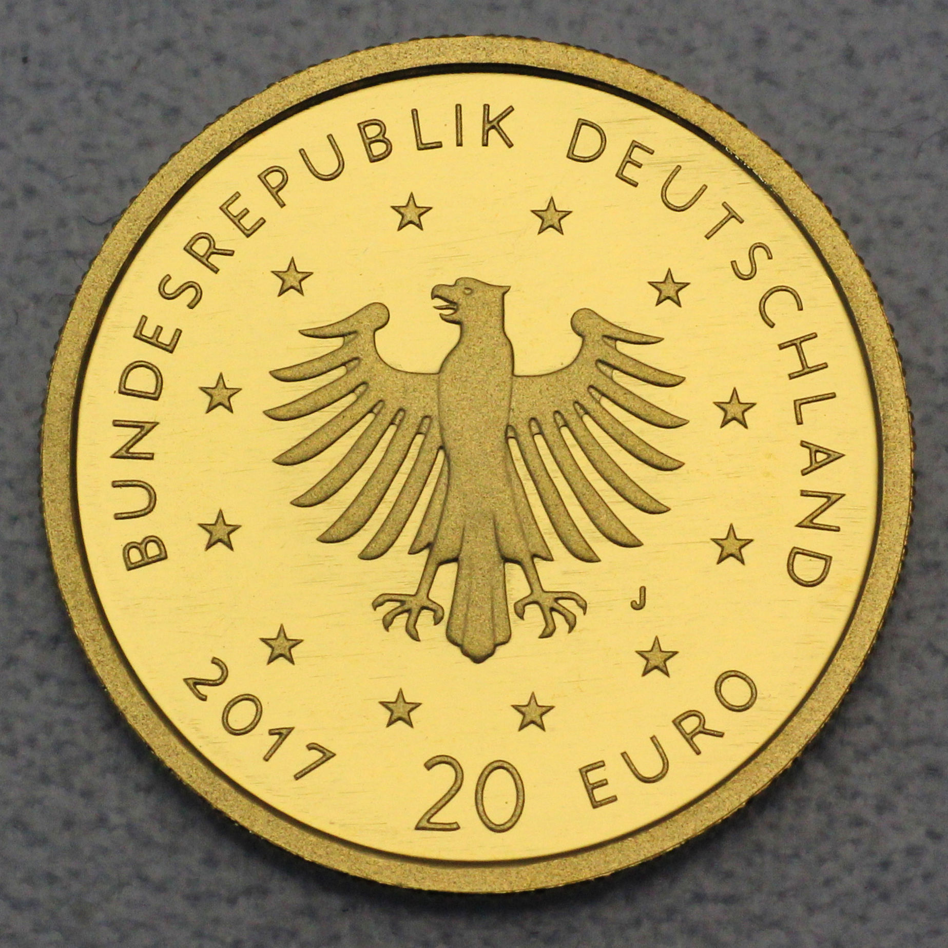 Die Kehrseite ist bei allen Münzen identisch. Sie zeigt den deutschen Bundesadler in stilisierter Form, dazu den Nennwert von 20 Euro, das Ausgabejahr, den Schriftzug "Bundesrepublik Deutschland" sowie die zwölf Europasterne als Symbol der europäischen Gemeinschaft. Ein zusätzlicher kleiner Buchstabe ergänzt hier das Kürzel der jeweiligen Prägestätte.