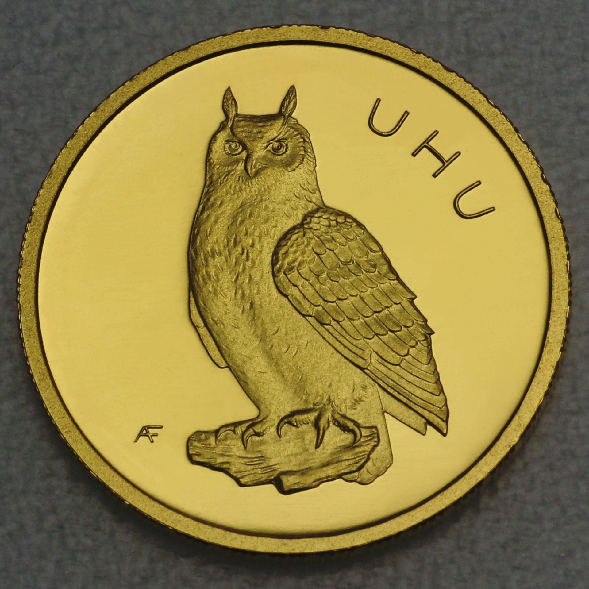 Uhus sind vorwiegend dämmerungs- und nachtaktive Greifvögel, die mit starker Flügelspannweite und lautlosem Flug beeindruckende Jäger sind. Sein charakteristischer Ruf – welcher der Aussprache seines Namens ähnelt – ist ebenso charakteristisch wie die Anpassungsfähigkeit an unterschiedliche Lebensräume. In letzteren spielen sie zumeist eine wichtige Rolle als Top-Prädatoren, da sie die Populationen kleiner Säugetiere und anderer Vögel durch ihre Jagd nach Nahrung im Gleichgewicht halten. In vielen Kulturen wurde der Uhu sowohl mit Weisheit als auch mit geheimnisvollen Nachtdeutungen verknüpft – Attribute, die in der künstlerischen Darstellung auf Münzen wie dieser ihren würdigen Ausdruck finden.