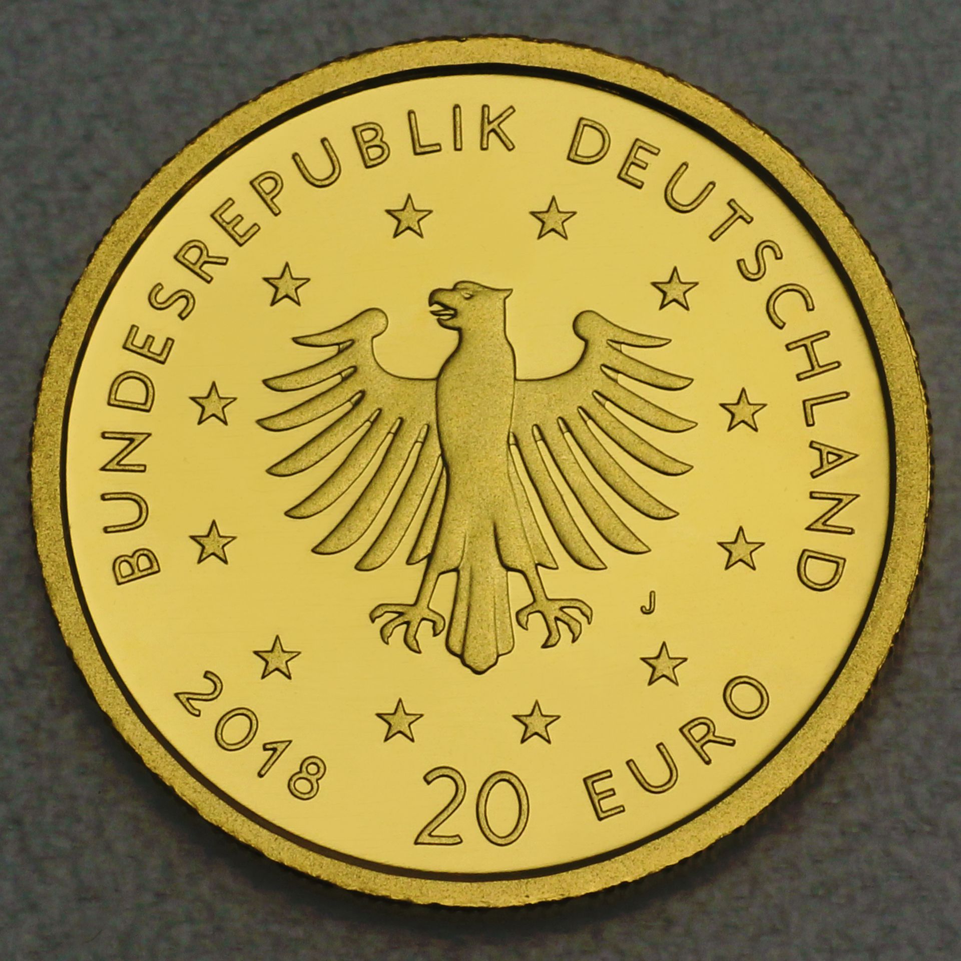 Die andere Seite der Münze trägt den stilisierten Bundesadler, der als deutsches Staatstier gilt. Rund um den Adler lesen sich die Deutschland-Umschrift, der Jahrgang 2018 sowie der Nennwert von 20 Euro. Hinzu kommen noch mehrere Sterne als Zeichen für Europa und dessen Zusammenhalt, mitunter auch wieder symbolisiert durch den Euro.