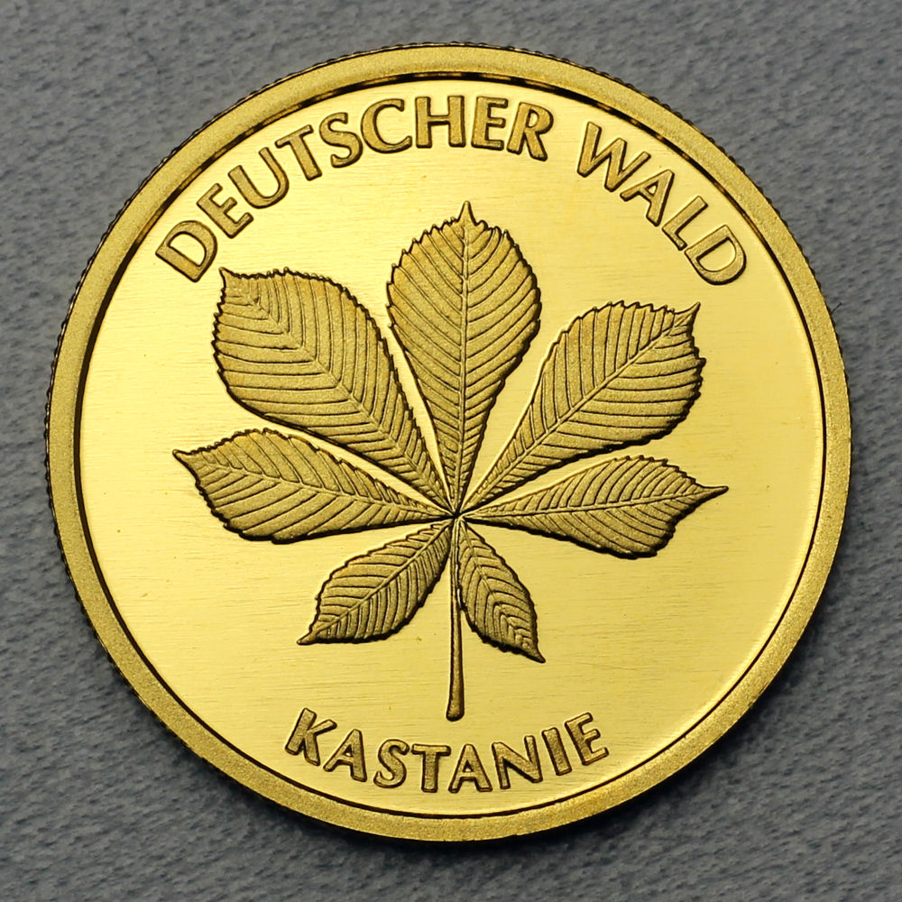 Die Wertseite zeigt ein kunstvoll ausgeführtes Kastanienblatt, dessen natürliche Konturen und markante Blattstruktur detailreich in Szene gesetzt wurden. Über dem Blatt erscheint der Schriftzug "DEUTSCHER WALD", direkt darunter die Bezeichnung "Kastanie", sodass das zentrale Thema der Serie klar erkennbar ist. Die sorgfältige Ausarbeitung der Blattadern und die plastische Gestaltung verleihen diesem Motiv einen lebendigen, organischen Ausdruck.