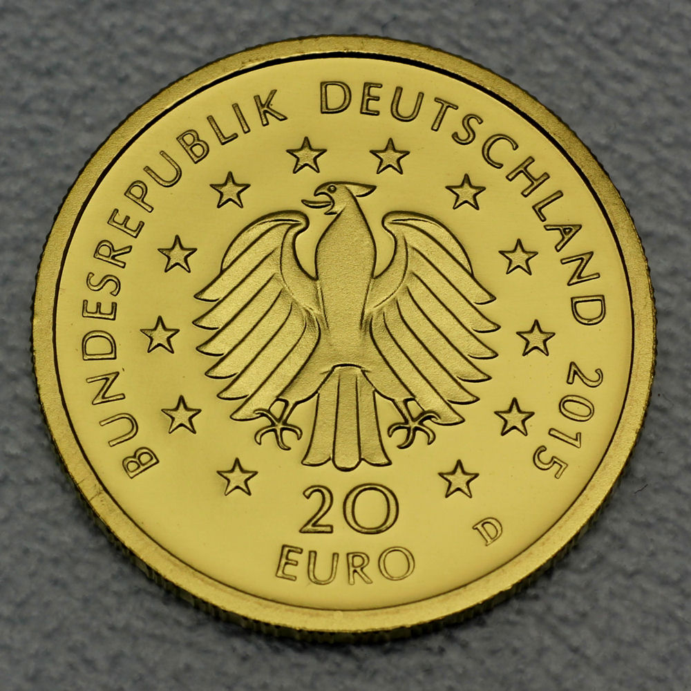 Auf der Wertseite ist der Bundesadler abgebildet, zwar klassisch dargestellt, aber mit stilisierten Abrundungen versehen. Umgeben wird er von der Umschrift "BUNDESREPUBLIK DEUTSCHLAND", dem Jahrgang 2015 und dem Nennwert von 20 Euro. Ergänzt wird das Bild durch die Münzzeichen der deutschen Prägestätten – ein Garant für Herkunft und handwerkliche Präzision. Der Münzrand ist fein geriffelt und sorgt für ein stimmiges Gesamtbild.