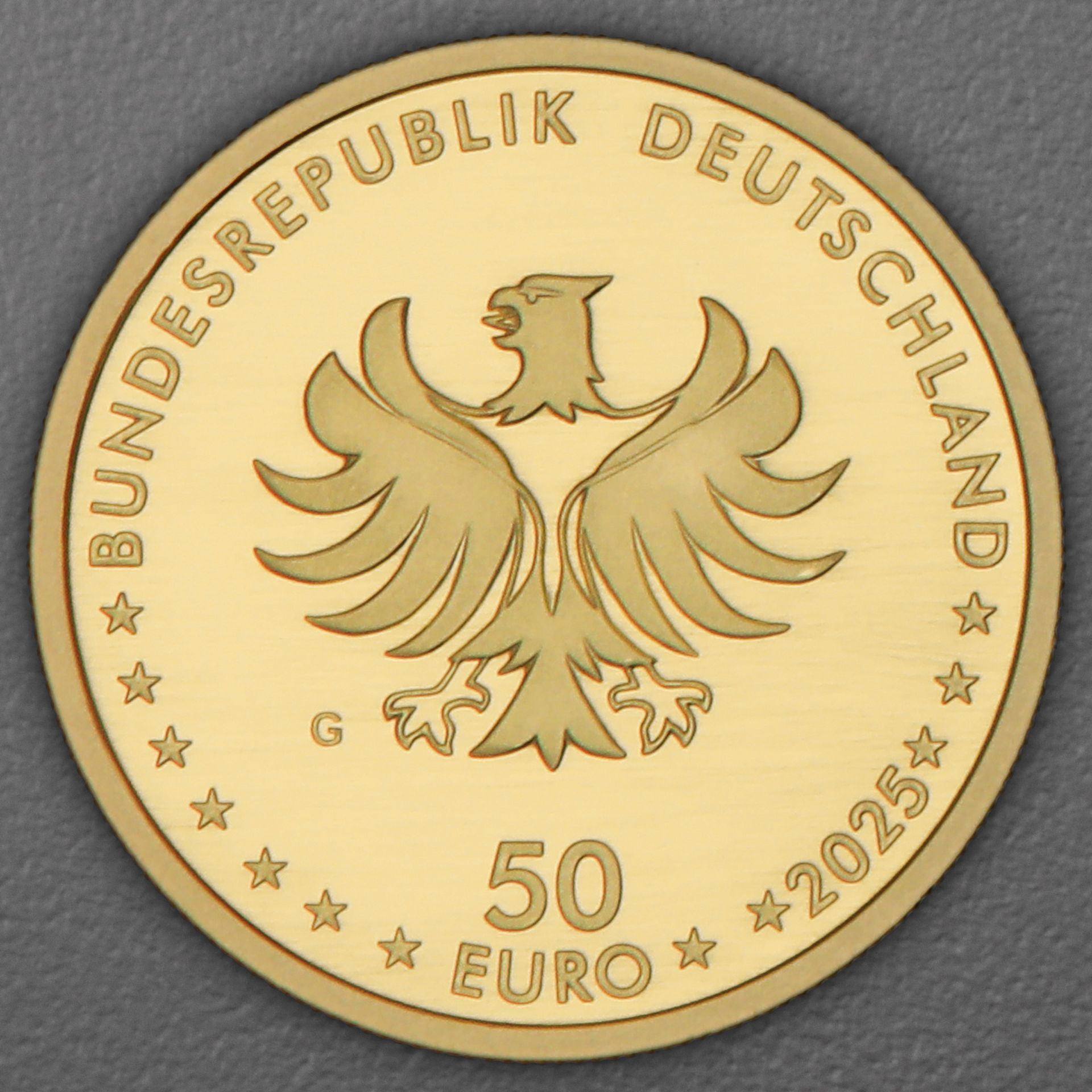 Die Zahlseite zeigt den Schriftzug BUNDESREPUBLIK DEUTSCHLAND, den Bundesadler, den Nennwert 50€, die zwölf Europasterne, sowie die Jahreszahl. Natürlich auch das jewelige Prägezeichen der Münzprägestätte A für Berlin, D für München, F für Stuttgart, G für Karlsruhe, und J für Hamburg.