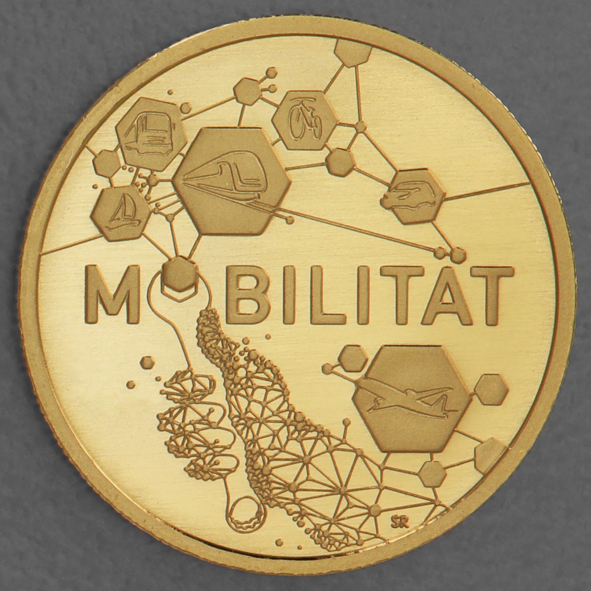 Die Motivseite der Münze entfaltet eine Bildsprache, die Mobilität als vernetztes Gesamtsystem interpretiert, dargestellt durch sechseckige Waben von Verkehrsnetzen.