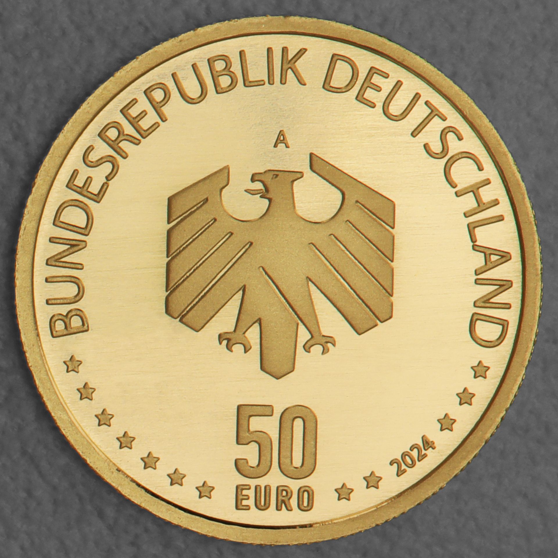 Die Kehrseite folgt dem einheitlichen Gestaltungsprinzip der meisten deutschen Eurogoldmünzen. Im Zentrum steht der Bundesadler in einer modernen, stilisierten Ausführung mit markanten Flügelpaaren. Um ihn herum sind die üblichen Angaben angeordnet – der Nennwert, das Ausgabeland, das Prägejahr sowie die zwölf Sterne der Europäischen Union.