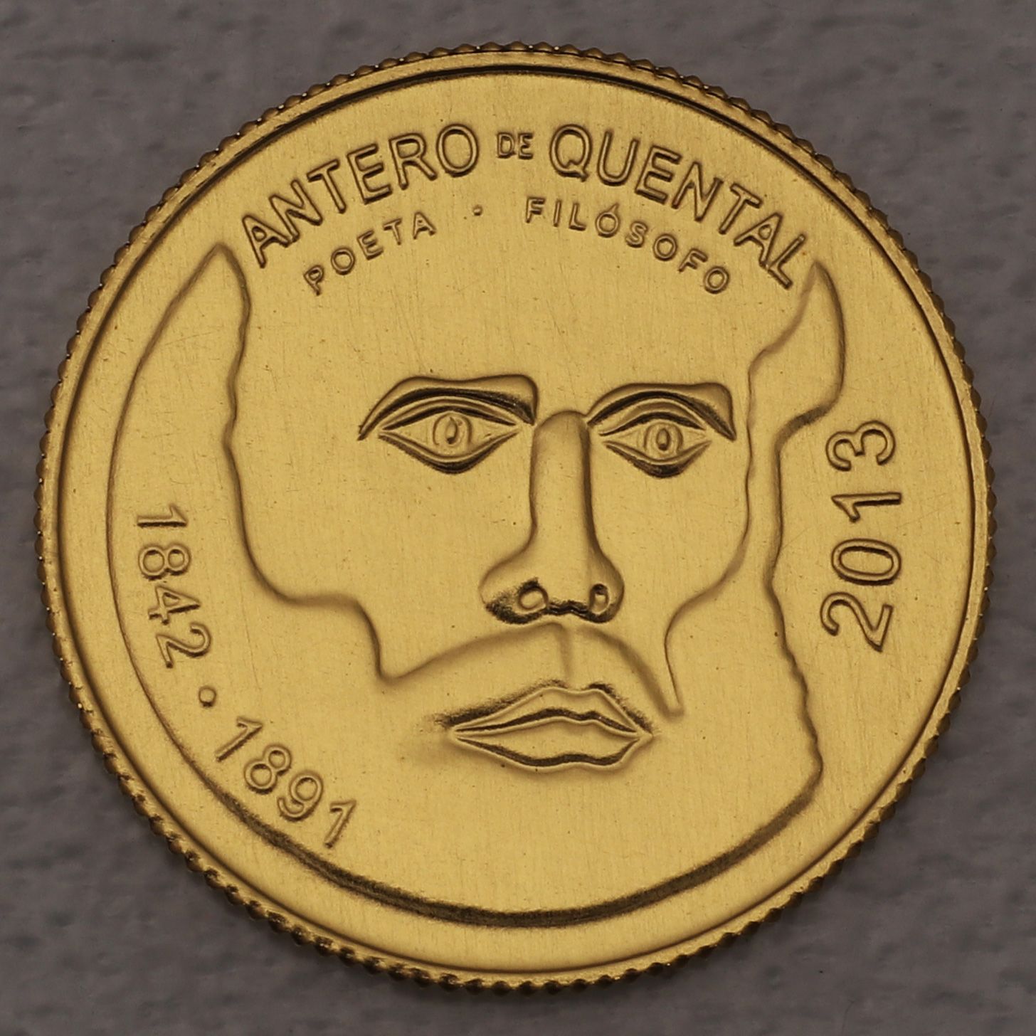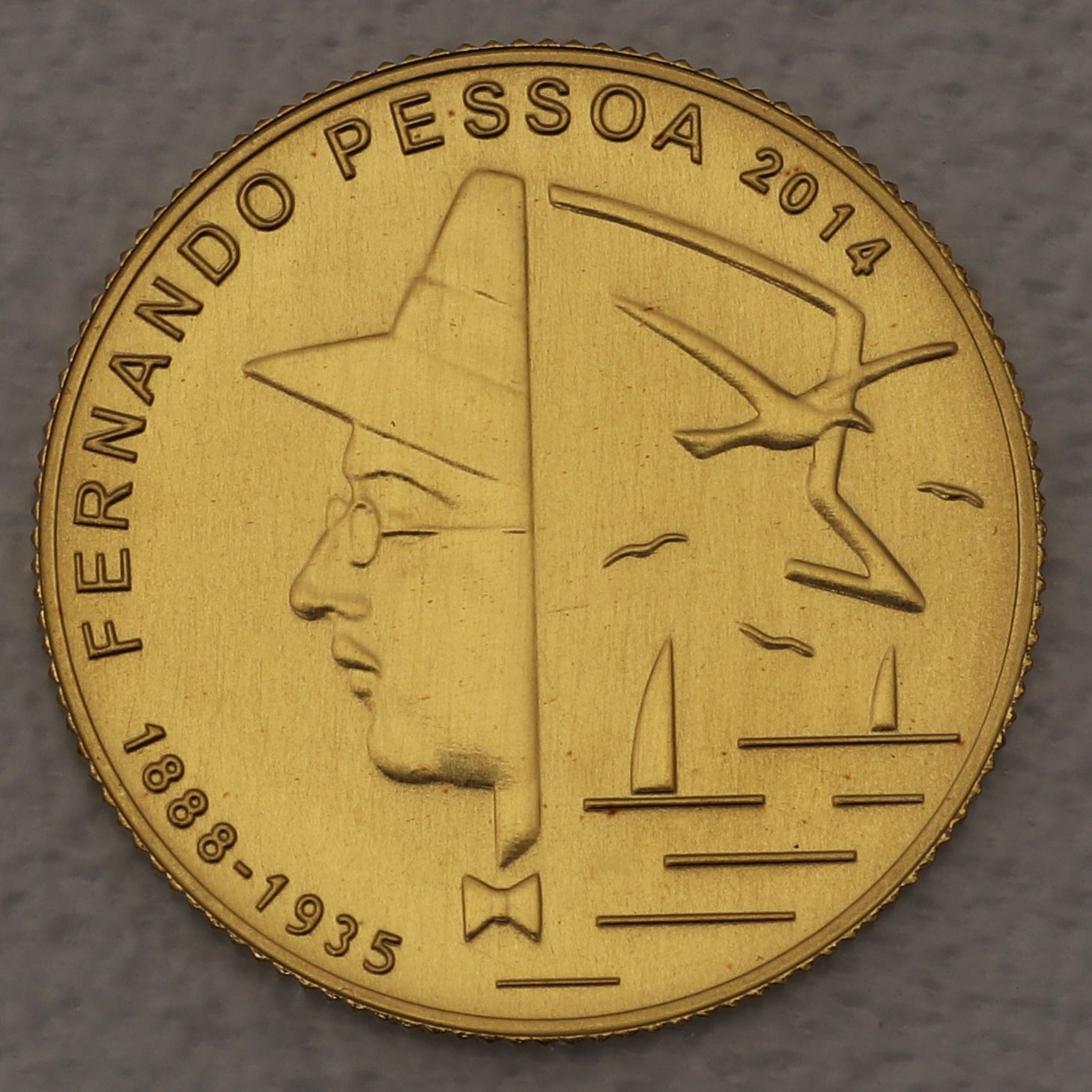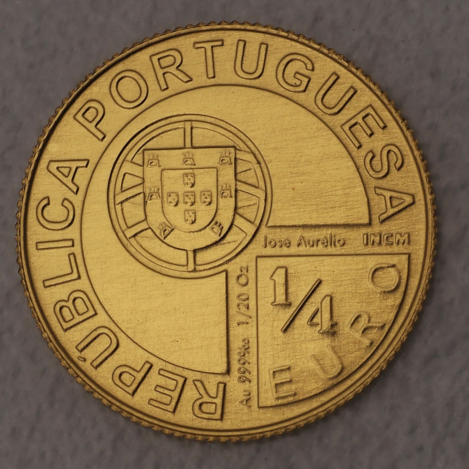 Seit 2003 prägt Portugal Euro-Goldmünzen für Anleger und Sammler. Die ausgegebenen 1/4 Euro, 2,5 Euro 5,- Euro, 7,5 Euro und 8,- Euro Goldmünzen sind modern gestaltet und zeigen verschiedene Motive von historischen portugisischen Personen über Jubiläen (z.B. 150 Jahre portugiesische Briefmarken), bis hin zu Sportmotiven.
