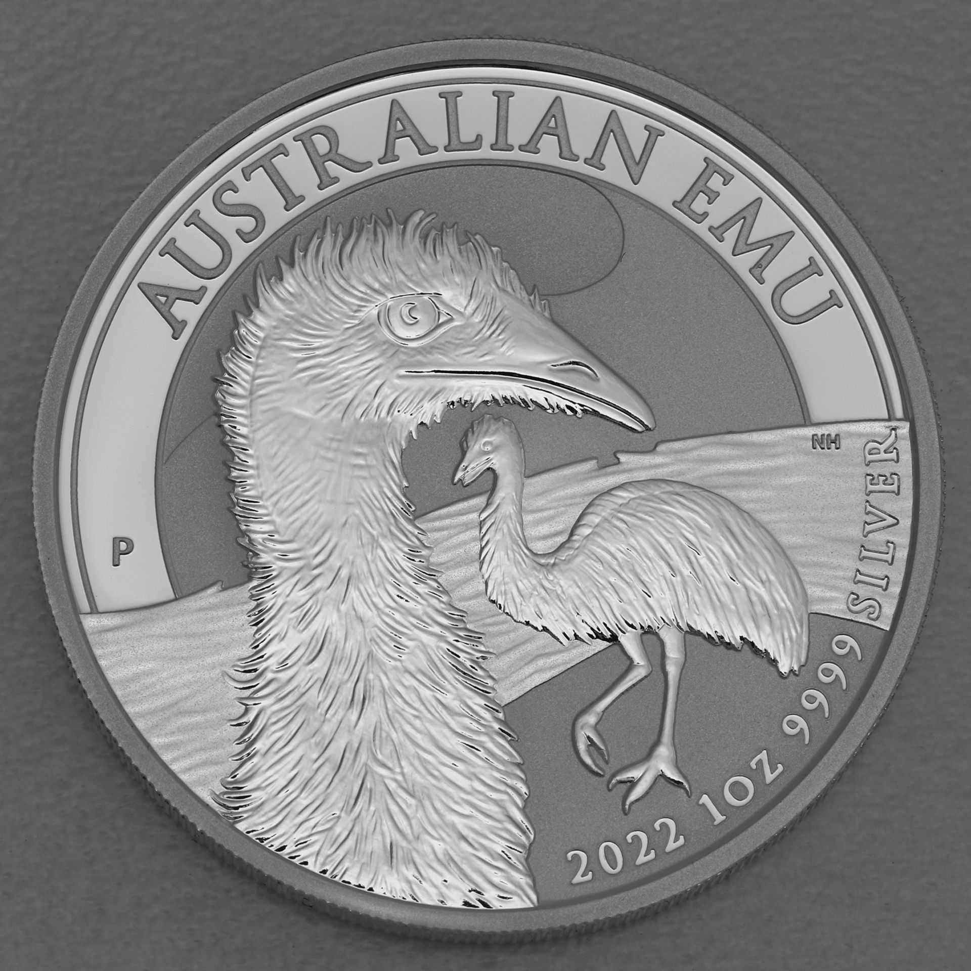 Das Ausgabejahr 2022 zeigt einen Emu im Vordergrund, bei dem nur Hals und Kopf zu sehen sind. Rechts ist im Hintergrund ein zweiter Emu zu sehen, der von rechts nach links läuft. Die glänzende Darstellung des Emus hebt sich vom matten Hintergrund ab und durch Schattenfall wirkt das Gefieder besonders plastisch. Hinter dem Tier verläuft ein matter Halbkreis, über dem auf glatte, Grund der Schriftzug "AUSTRALIAN EMU" steht. Das "Mintmark" der Perth Mint ("P") ist links innerhalb des glänzenden Bereichs platziert. Unterhalb der Darstellung finden sich die Prägeangaben 2022, 1oz sowie der Feingehalt von 999,9 Tausendstel Silber.