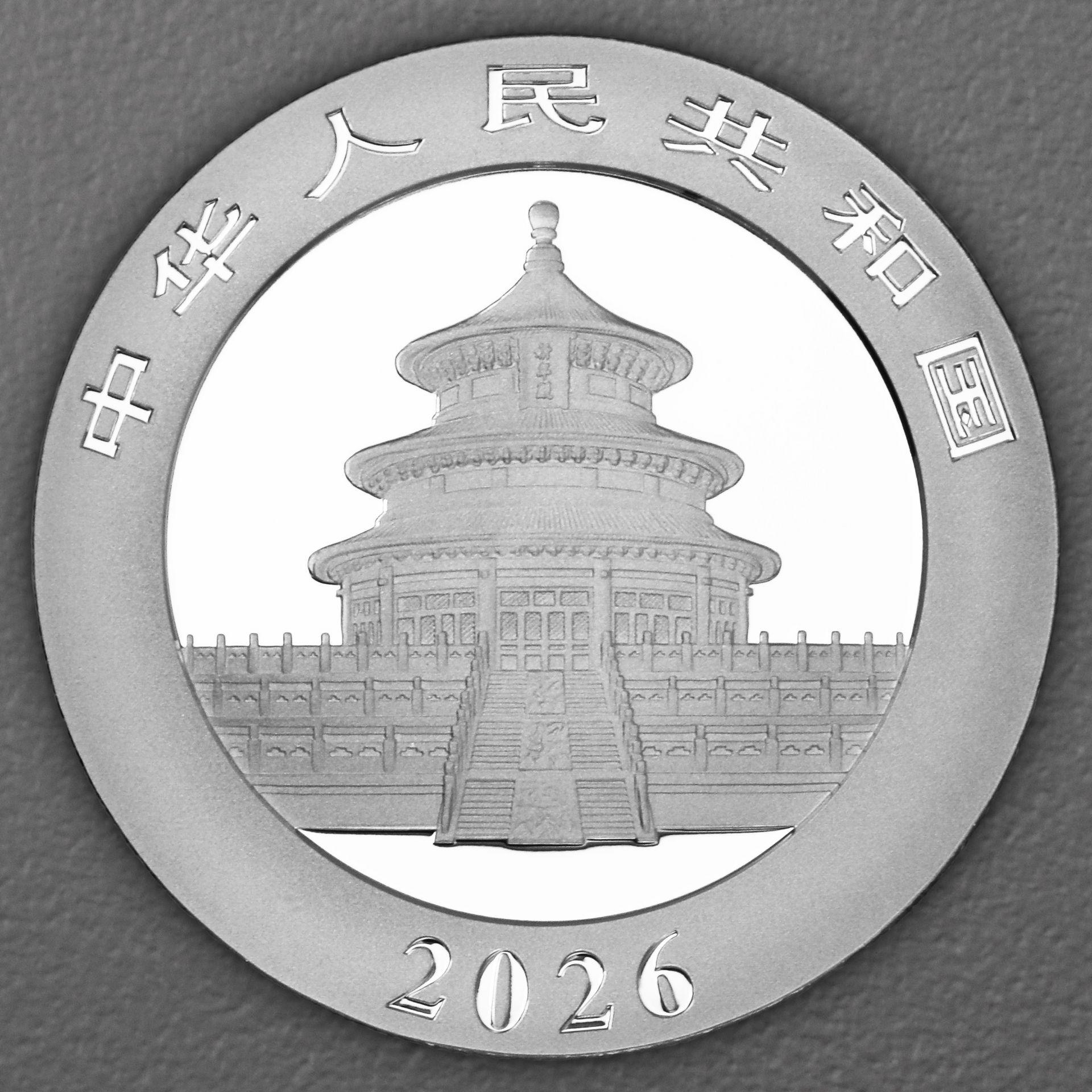 Das Motiv der Ausgabe von 2026 konzentriert sich auf zwei Pandas, die dicht aneinandergeschmiegt auf ihren Hinterläufen sitzen und die Beinchen nach vorne strecken. Die Prägetechnik lässt die typische schwarz-weiße Fellstruktur je nach Lichteinfall besonders lebensecht erscheinen. Die Tiere ruhen auf einem felsigen Untergrund, dessen feine Risse und Furchen bis zu einem kleinen, durch fließende Linien angedeuteten Wassertümpel im Vordergrund reichen. Zu beiden Seiten ragen kräftige Bambusrohre samt Blättern in die Szene. Rechts sprießen zusätzlich noch junge, keilförmige Triebe. Links umfasst einer der Bären mit seiner Pfote eine der Bambuspflanzen. Der Nennwert in Yuan ist im unteren Bildbereich gut sichtbar platziert. Entlang des oberen Münzrands findet sich die Angabe "Ag .999" sowie das jeweilige Gewicht, das seit 2016 in Gramm angegeben wird.
