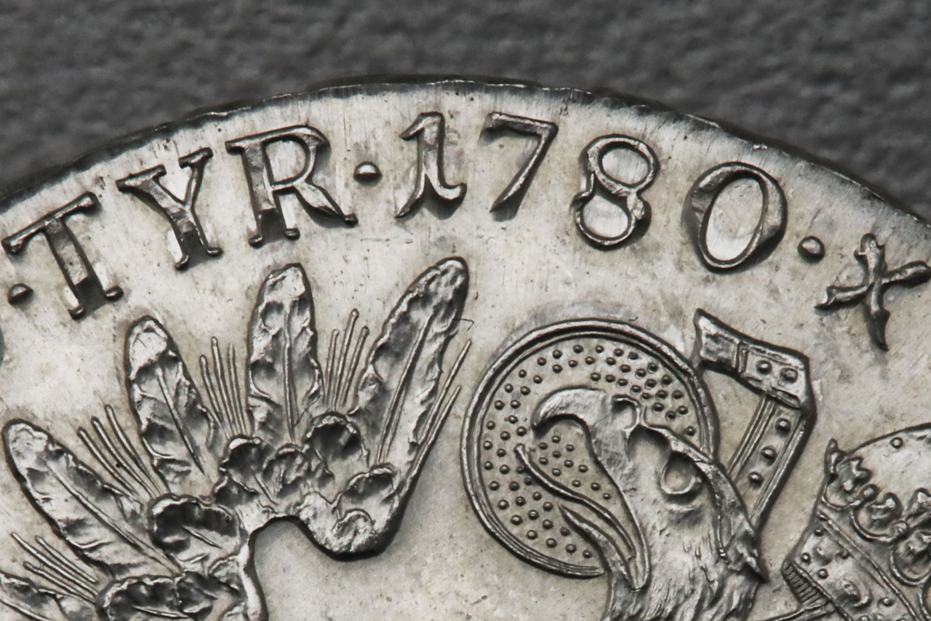 Auf der Kehrseite präsentiert sich stolz der doppelköpfige Reichsadler, der andeutet, seine Flügel zu spreizen. Seine Krallenfüße streckt er seitlich weg. Die beiden Köpfe sind jeweils seitlich nach links und rechts gedreht. Auf der Brust trägt er das Schildwappen der Habsburger, welches doppelt gekrönt ist, wobei über dem Adler nochmals eine größere Kaiserkrone schwebt. Von dieser schnörkeln sich zwei Bänder abwärts zu den Seiten hin. Allgemein besitzt das Münzbild eine erkennbare vertikale Symmetrie, die lediglich durch das zentrale Wappen gebrochen wird. Auch hier findet sich eine Randschrift: "ARCHID. AVST. DUX BURG. CO. TYR. 1780 X". Auch dies entspricht lateinischen Abkürzungen, die ins Deutsche übertragen "Erzherzogin von Österreich, Herzogin von Burgund, Gräfin von Tirol, 1780" bedeuten.