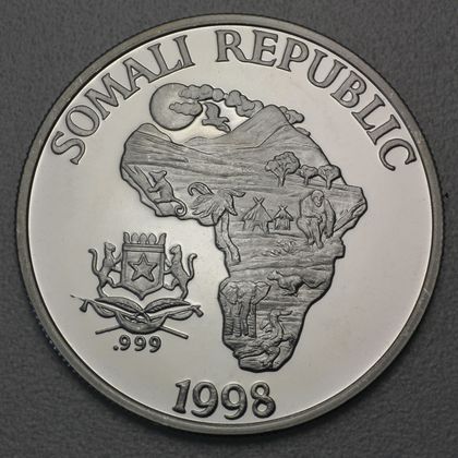 Die "African Somalia Monkey" Münzserie wurde von 1998 bis 2004 als Agenturausgabe herausgegeben. Die 1oz Silbermünze wurde in 999er Silber mit einer geringen Auflage von 10.000 Stück geprägt.