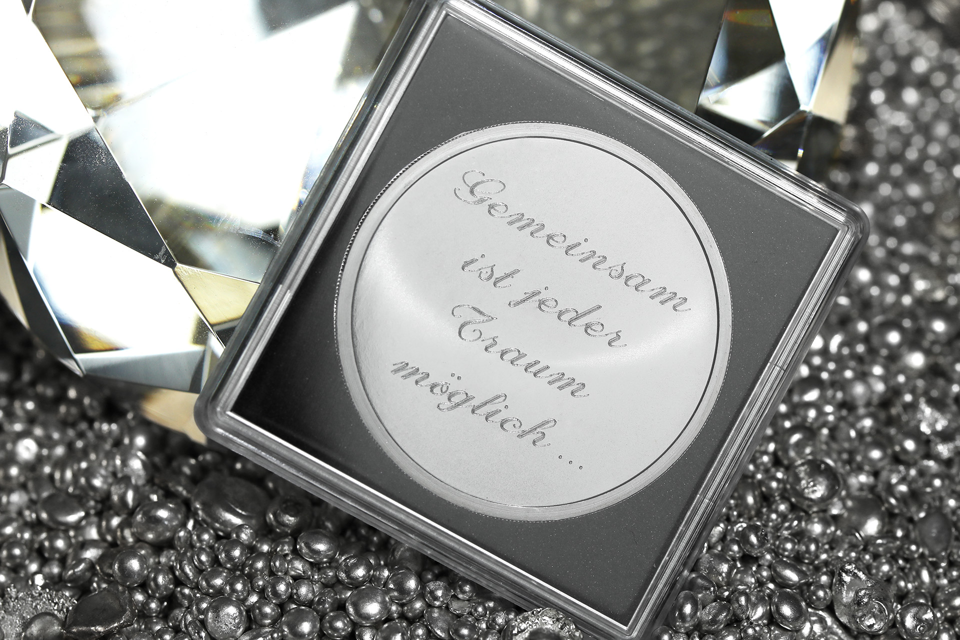 Silber in verschiedenen Barrenformen – beispielsweise zu 1oz, 100g oder als 3D-Barren – als Mini-Silberbesteck, aber auch als runde Medaille lässt sich durch Textgravuren, die Gravurumsetzung von Fotos und Logos oder einer thematischen Motivgravur in unvergessliche Geschenke verwandeln.
